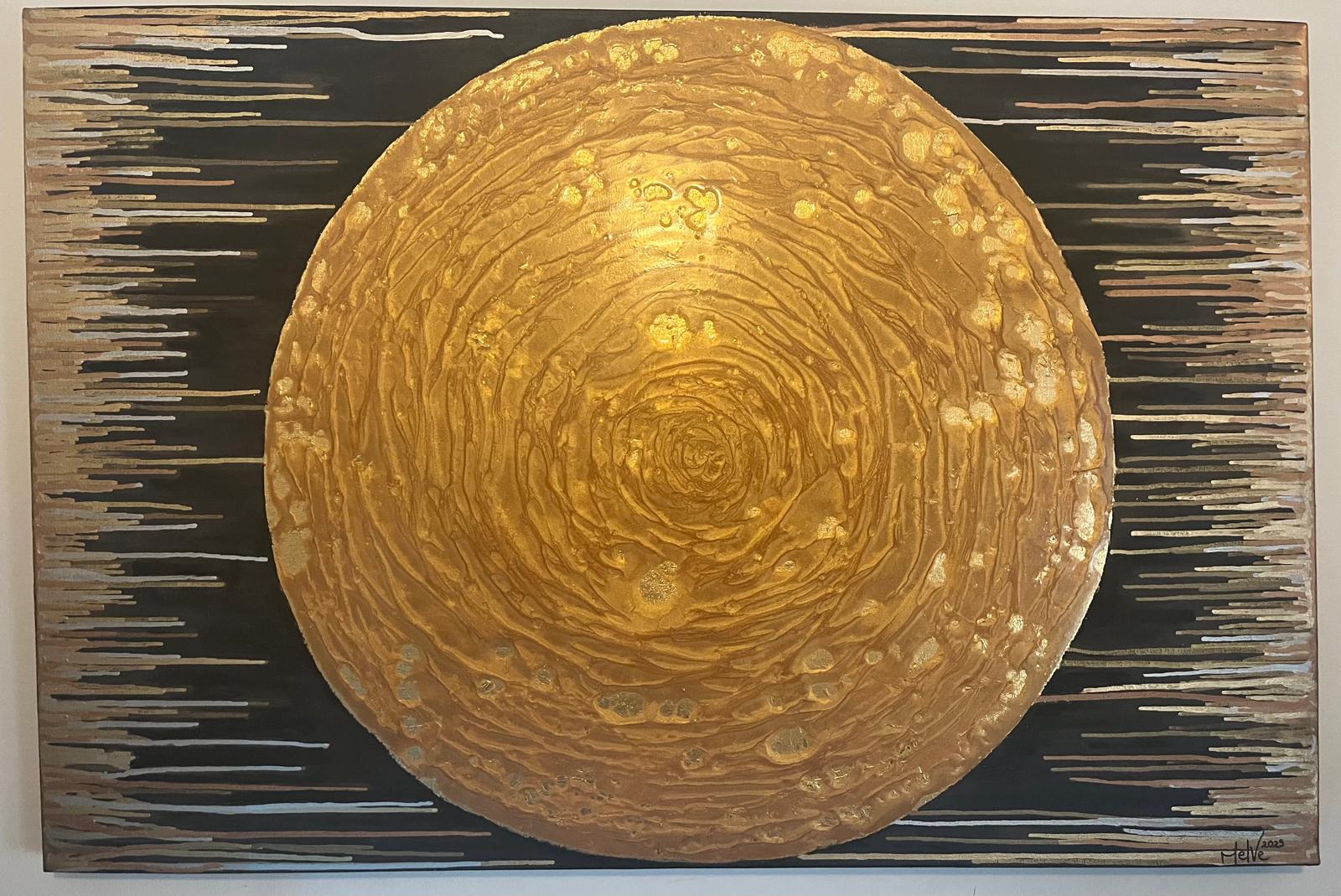 GOLDEN SUN – An abstract art piece crafted with oil paint, alcohol inks, gold leaf and holographic pearl resin.