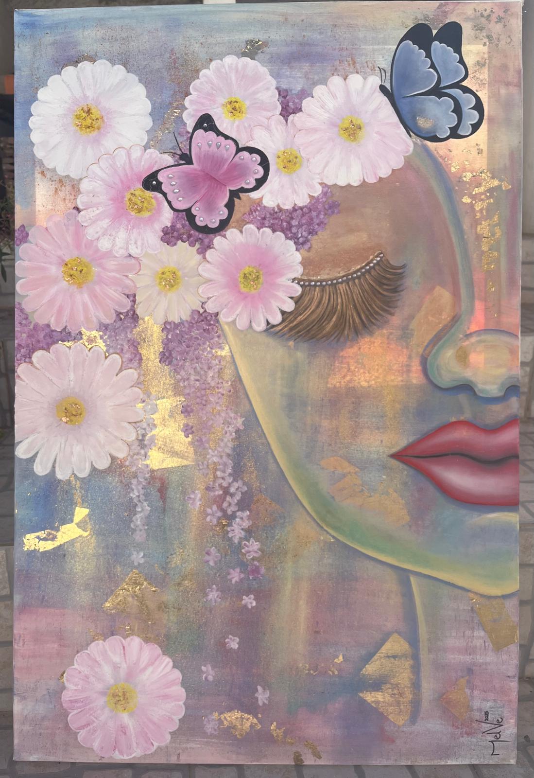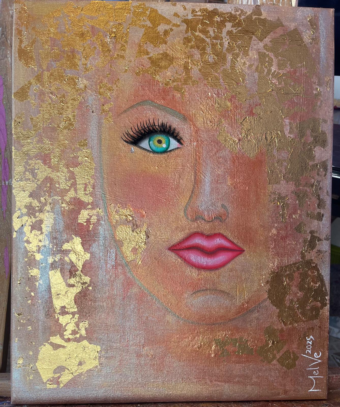 Oil paint on box canvas, crafted with 24 carat gold leaf, mica, false lashes and a single teardrop crystal.