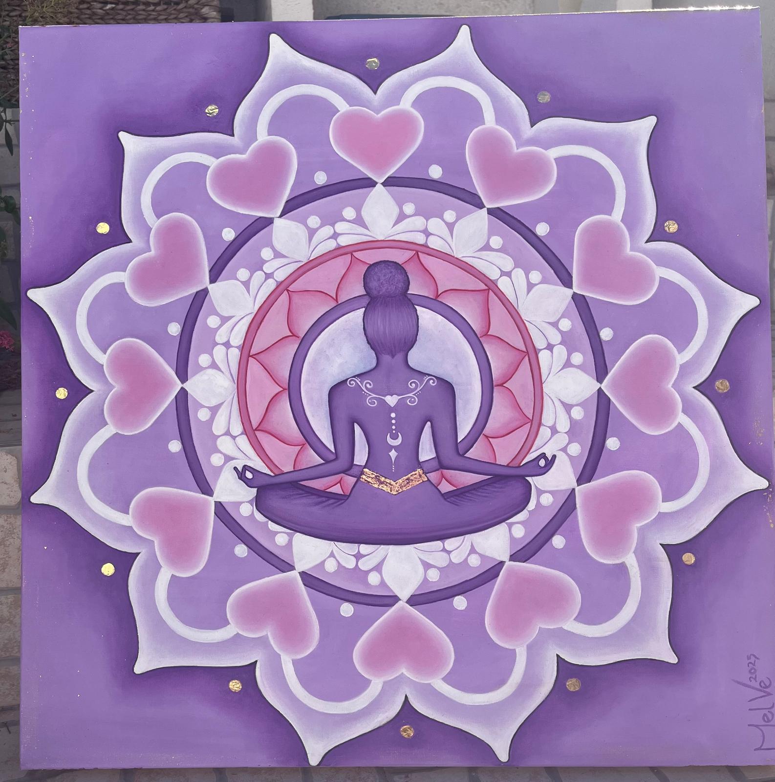 This artwork in oils was inspired by the artist’s many psychedelic experiences using Magic Mushrooms, as well as her love of yoga. It forms one of the many characters that the artist has either created, or reinterpreted from other sources.