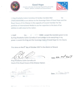 On 4 October 2017, Mel Ve was appointed by royal mandate as the International Media Advisor to the Royal House of the Khoisan Nation until 4 October 2018, during the First Nation secession of the Khoisan territory, being the Cape Province within South Africa, with this effort going all the way to the United Nations in New York.